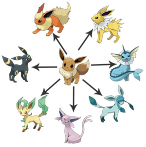 Il existe dix-huit types (voir la liste ci-contre). Chaque Pokémon possède un ou deux types qui conditionnent la plupart de ses attaques et caractérisent ses forces et ses faiblesses vis-à-vis des autres types, organisées comme le pierre-papier-ciseaux pour équilibrer les combats13. De nombreux Pokémon se transforment en une nouvelle sorte (ce phénomène est appelé une « évolution ») après avoir atteint un certain niveau d'expérience ou d'autres critères plus complexes (objets, échange, etc) ; cela leur donne souvent de meilleures statistiques de combat et parfois un nouveau type. En tout, un Pokémon de base peut évoluer au plus deux fois. Quelques Pokémon peuvent évoluer de plusieurs manières différentes (l'archétype de ces Pokémon est Évoli). Les types Acier et Ténèbres apparaissent dans la deuxième génération (Pokémon Or, Argent et Cristal), de même que le type Fée apparaît dans la sixième génération (Pokémon X et Y). Ils sont principalement attribués à des monstres propres à ces nouvelles générations, toutefois des Pokémon des générations antérieures se sont également vu attribuer ces types. Magnéti, créé dans la première génération en tant que type Électrique, est ainsi du double-type Électrique et Acier à partir de la deuxième génération. Depuis l'apparition de la sixième génération, il existe un nouveau système d'évolution nommé "méga-évolution", décliné de deux manières différentes : la Primo-Résurgence (réservée à Kyogre et Groudon) et la méga-évolution classique. Cette dernière se réalise par l’intermédiaire d'une pierre portée par le Pokémon, dont le nom se compose de celui du Pokémon et du suffixe-ite (exemple : Braségalite pour Braségali). Lors de la septième génération, c'est une autre forme d'évolution qui a fait son apparition, pouvant être assimilée au résultat d'une spéciation allopatrique. Ainsi, sur les îles d'Alola, on trouve des formes endémiques de certains Pokémon comme Noadkoko, appelées sobrement "formes régionales". Les "capacités Z" apparaissent également.