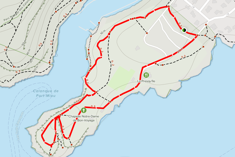- Le départ de la balade se situe au croisement de l’avenue Notre-Dame et de l’avenue de la Plage Bleue, là où se trouve le panneau d’accueil du Parc national des Calanques. Le cheminement se suit très facilement, notamment grâce à des plaques émaillées qui permettent d’en savoir plus sur les Calanques et l’histoire des lieux.